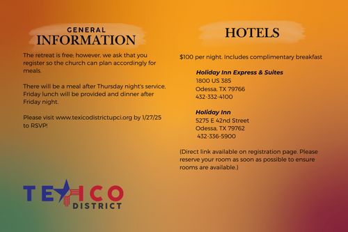 The Ministers and Wives Retreat is free, however we ask that you register to allow the church to plan accordingly for the meals that will be served. Thank you all for everything that you do to make the Texico District the best district in the UPCI!